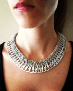 The Gray Soda Pop Tab Crochet Necklace is a unique, eco-friendly jewelry piece made from recycled aluminum soda tabs. The crochet design creates a soft texture, contrasting with the metallic sheen of the tabs. This necklace is perfect for casual outings, festivals, or as a conversation starter, aligning with eco-conscious fashion trends. The necklace’s handmade nature ensures each piece is unique, making it a great choice for environmentally conscious consumers. Its lightweight design makes it comfortable to wear for extended periods without discomfort. The necklace challenges conventional notions of beauty and utility, making it a statement about recycling and creative reuse in fashion.