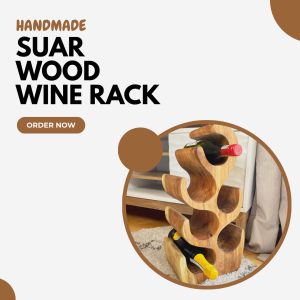This handmade Suar wood wine rack is a practical and elegant storage solution for wine enthusiasts. It features a rustic charm and artisanal craftsmanship, with no two racks being identical. The rack’s open design allows easy access to bottles and displays them attractively. It serves as a decorative accent, enhancing the ambience of any room and promoting appreciation for handmade goods and sustainable materials. The rack’s unique handmade nature and natural wood tones create a warm, inviting atmosphere.