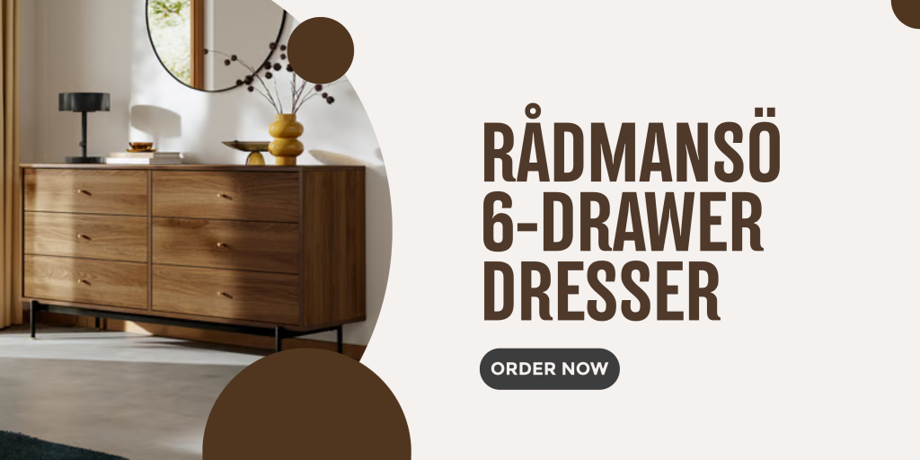 The RÅDMANSÖ 6-drawer dresser from IKEA is a mid-century design inspired by sleek lines and a warm walnut tone. It measures 62 5/8″ wide, 18 7/8″ deep, and 31 7/8″ high, offering six generous drawers for storage and a spacious top surface for displaying decorative items. The dresser’s warm walnut finish and sleek mid-century design elevate the look of any bedroom, creating a cozy yet refined atmosphere. Its unique design, featuring push-to-open drawers and a warm walnut effect veneer, sets it apart from other basic dressers, making it both functional and decorative.