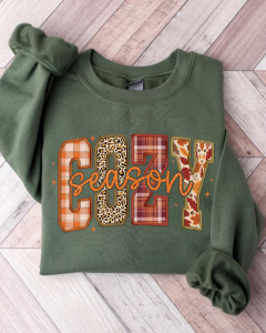 The “Cozy Season Sweatshirt” is a women’s fall sweater featuring a retro-inspired graphic print celebrating the warmth and comfort of autumn. It is perfect for layering during cooler months and pairs well with casual fall outfits. Available in multiple fall colors, such as burnt orange, mustard yellow, deep reds, browns, and olive greens, the sweatshirt reflects the natural hues of autumn leaves. It stands out as a handmade or custom piece on Etsy, offering a nostalgic and seasonally relevant style.