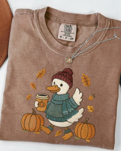 The Comfort Colors® Faux Embroidered Just a Fall Goose Shirt is a cozy autumn-themed T-shirt featuring a playful goose graphic. The shirt is available in multiple autumn colors, such as burnt orange, deep reds, mustard yellows, olive greens, and browns. The shirt’s unique design mimics embroidery, giving it a textured, handcrafted appearance. The shirt’s soft, durable, vintage-washed feel makes it a perfect gift for Thanksgiving or fall celebrations. The shirt’s playful design and seasonal relevance make it a distinctive wardrobe staple.