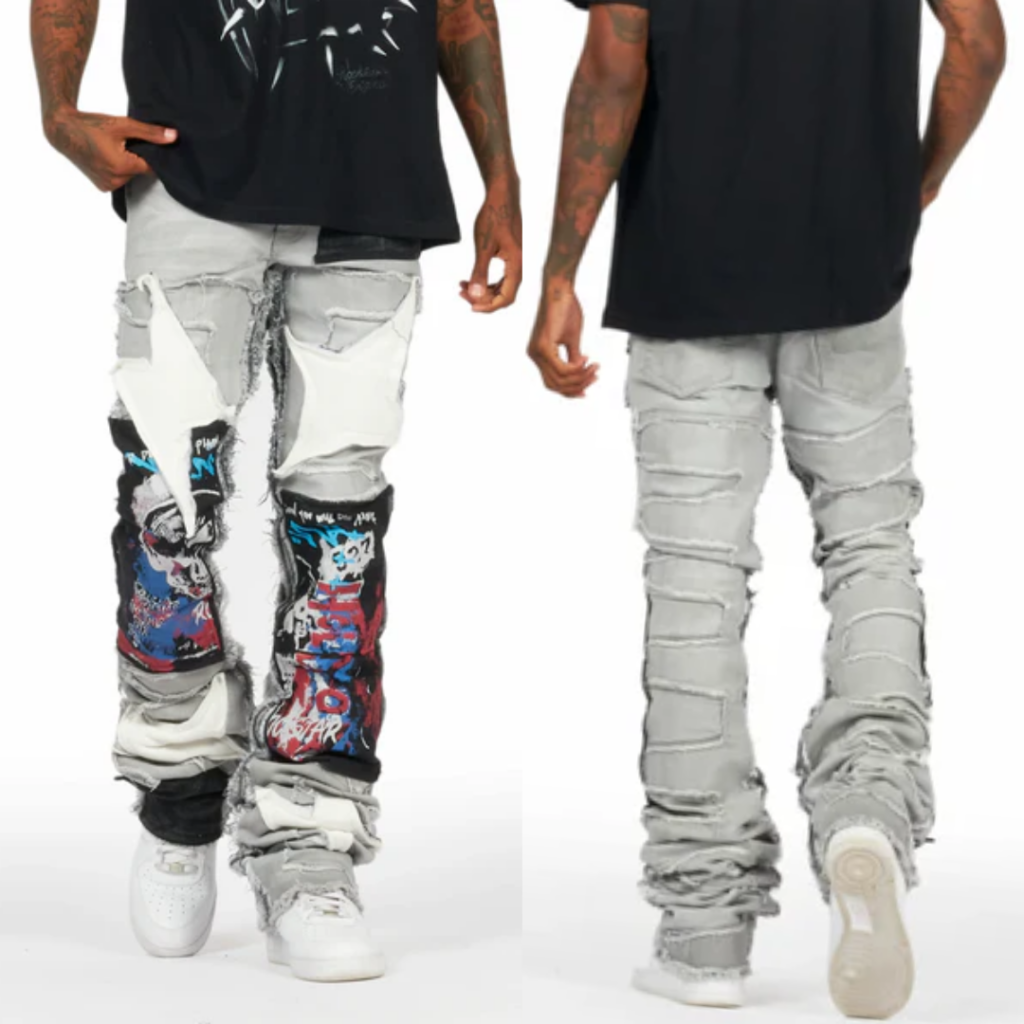 The Vinson Patchwork Super Stacked Flare Jean in dark grey is a unique piece made from organic cotton, designed to elevate any streetwear wardrobe. It features a unique patchwork design with patterned stitching, flared leg openings, and extra-long seams, creating a stacked effect at the hem. The jeans are pivotal for street style due to their bold aesthetic and versatile functionality. They promote self-expression and innovation in fashion, allowing for creative layering and personal expression. The distressed detailing and raw edges further enhance their urban appeal. The jeans can be paired with oversized graphic tees, cropped hoodies, tailored jackets, or chunky sneakers or combat boots to create a dynamic range of outfits that reflect personal style.