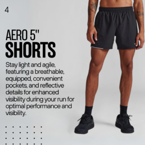 Comfort meets functionality with the Aero 5″ Shorts. These shorts feature a lightweight and breathable fabric that promotes airflow, ensuring you stay cool during your workouts. The black and silver reflective design enhances visibility, making them suitable for evening runs. With a 5-inch inseam, these shorts offer the perfect balance of coverage and freedom of movement.