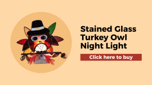 The Stained Glass Turkey & Owl Night Light is a decorative night light featuring vibrant stained glass designs of a turkey and an owl, ideal for enhancing Thanksgiving ambiance. The turkey, adorned with a pilgrim hat and warm colors, and the owl with intricately detailed feathers, provide soft illumination suitable for cozy spaces. Made from durable stained glass and UL listed for safety, this handcrafted piece combines functionality with festive charm. Its unique aesthetic and warm glow make it a delightful addition to holiday décor.